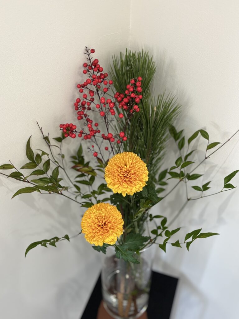 明るい黄色の菊。まるいフォルムがかわいくて選びました。それに合わせて赤い実と松のグリーンを合わせてもらいました☺︎